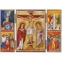 - Les mystères chrétiens ou les fêtes liturgiques ; pour ne citer que les principaux : la Très-sainte Trinité qui est le mystère central de la religion catholique et dont la solennité liturgique est fixée au dimanche qui suit la fête de la Pentecôte. Après viennent les mystères qui ont pour sujet le Sauveur Seigneur Jésus : le mystère de Noël ou Nativité du Fils de Dieu dans la grotte de Betléhem, popularisé par les crèches, les autres mystères qui concernent l'Enfant-Jésus raconté dans l'Evangile. Nous proposons bien sûr des diptyques dont le sujet est lié à la vie publique du Rédempteur et plus spécialement la crucifixion, la Résurrection, Pentecôte, etc... Après les diptyques consacrés à Jésus-Christ est à ses mystères, la Vierge-Marie tient la première place avec l'Annonciation, l'Immaculée-Conception, l'Assomption.