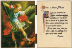 - sur l'autre pendant saint Michel est représenté selon l'iconographie classique mais avec en plus dans la main gauche un étendard avec sa devise et l'image du Sacré-Coeur. Au revers, se trouve écrit, en encadrement, le chant angélique de la Nativité, Gloria in excelsis, etc., et dans le centre, l'invocation au saint Archange de nous défendre dans le combat contre ses ennemis.