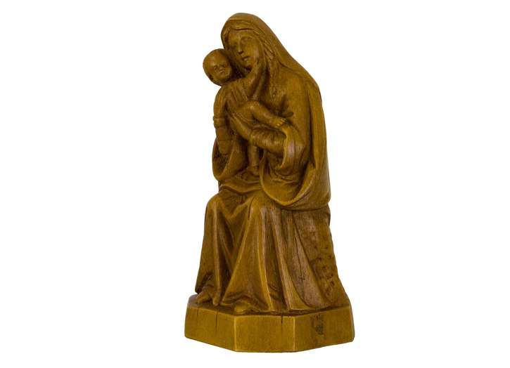 La statue de la sainte vierge qui vous est ici proposée représente la Mère de Dieu tenant l'Enfant Jésus dans ses bras. Notre-Dame est assise et porte son Divin fils contre sa joue dans une affectueuse embrassade. Cette statue de la vierge Marie, réalisée en résine, imite le bois avec beaucoup de réalisme. La statuette mesure 15 cm. La position assise de cette Vierge à l'Enfant dans le style médiéval nous rappelle l'invocation des litanies de Laurette Sedes sapientiae : Marie trône de la Sagesse. Jésus en effet est le Verbe de Dieu, la Sagesse éternelle du Père, qui a pris chair de la Bienheureuse vierge Marie par l'opération du Saint Esprit. L'assomption de la nature humaine par le Verbe nous est signifiée par le mouvement ascendant de l'enfant vers sa Mère, elle nous fait entrer dans la famille du Dieu Un et Trine. Cette proximité est joliment suggérée par l'inclination de la Mère vers l'enfant.
