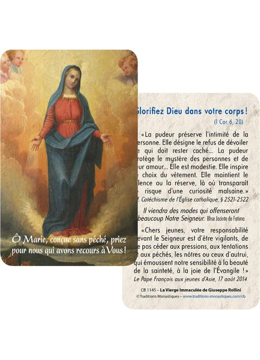 De la taille d'une carte bancaire, cette carte-prière représente La Vierge Immaculée de Giuseppe Rollini avec au dos des textes sur la pudeur : Glorifiez Dieu dans votre corps ! : Glorifiez Dieu dans votre corps !