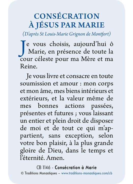 Je vous livre et consacre en toute soumission et amour : mon corps et mon âme, mes biens intérieurs et extérieurs, et la valeur même de mes bonnes actions passées, présentes et futures ; vous laissant un entier et plein droit de disposer de moi et de tout ce qui m'appartient, sans exception, selon votre bon plaisir, à la plus grande gloire de Dieu, dans le temps et l'éternité. Amen. (D'après St Louis-Marie Grignion de Montfort)