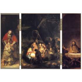 Panneau central : L'Adoration des bergers - Panneaux latéraux : Le retour du fils prodigue et Les pèlerins d'Emmaüs Référence: TRT125Triptyque Les Mystères...