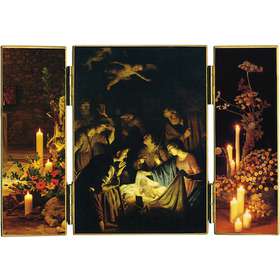 Panneau central : La Naissance du Christ - Panneaux latéraux : motif floral Référence: TRT69CTriptyque Les Mystères...